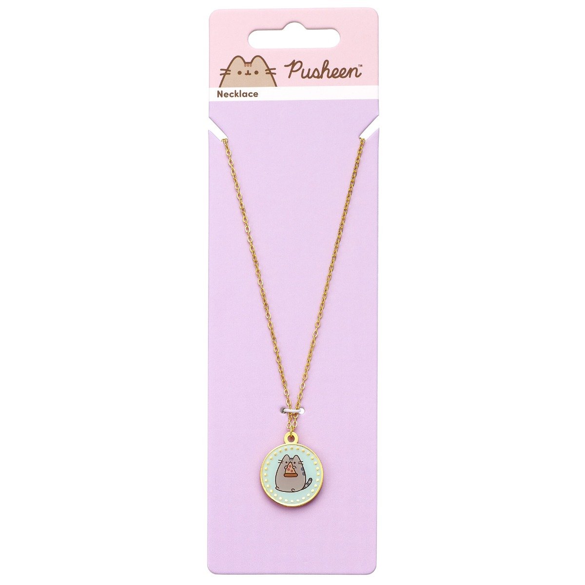 This stunning blue enamel & gold-tone necklace has a circular pendant featuring Pusheen the Cat enjoying her favorite meal–pizza.